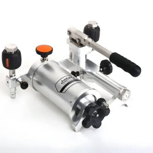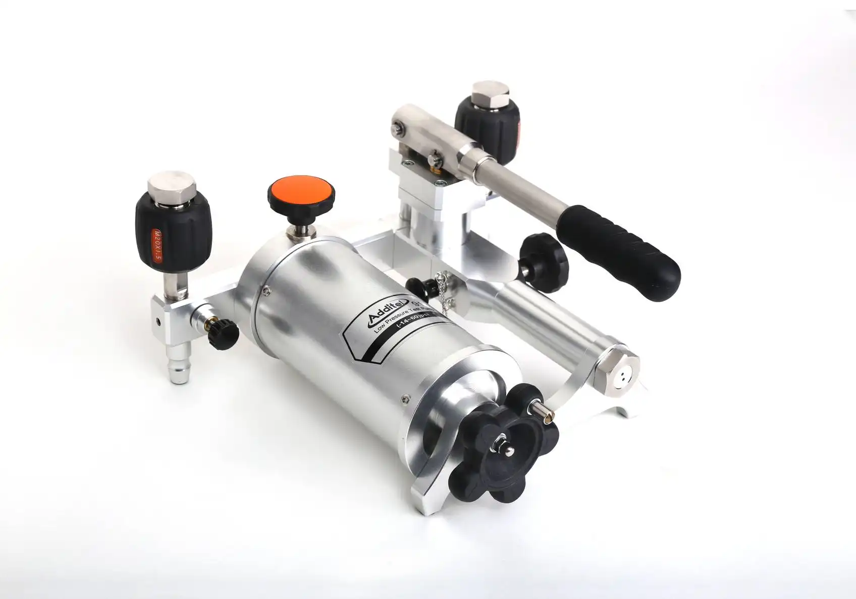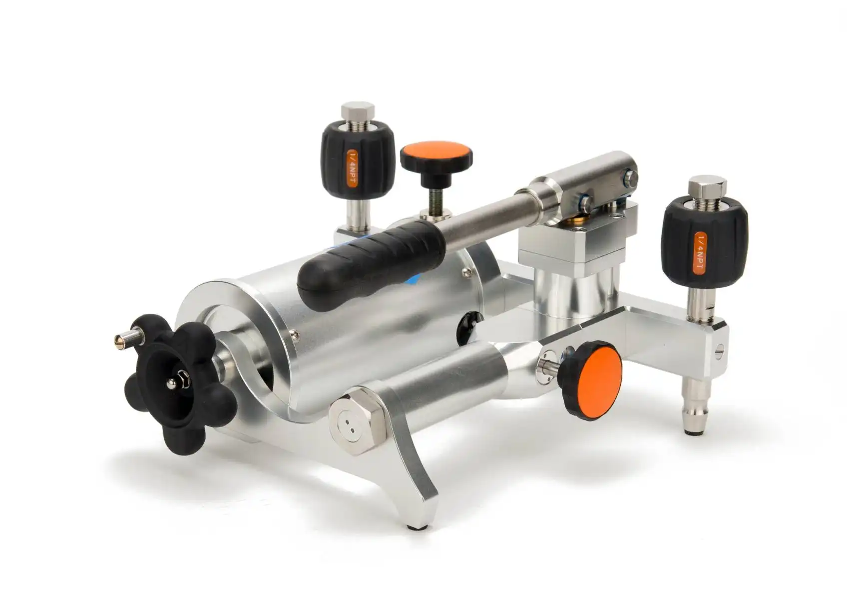 The 912A Pneumatic Pressure Test Pump is a hand operated pressure pump designed to generate pressure from 95% vacuum to 60psi (4bar). A high-quality screw press is designed for fine pressure adjustment, with an adjustment resolution up to 0.1 Pa (0.001 mbar). The 912A is a very stable low pressure calibrator. It makes use of an isothermal bellows chamber which is designed for reducing the possible effects of environmental temperature change. Most pumps make use of a check valve (non-returning valve) and are not well insulated which will cause large fluctuations in pressure with a change in ambient temperature or when the unit is touched. The 912A does not use a check valve and is remarkably stable. Two hand-tight connectors installed on the pump allow easy connecting and disconnecting to the test pump without the need for PTFE tape or wrenches. The 912A is an ideal comparison test pump for low pressure application.