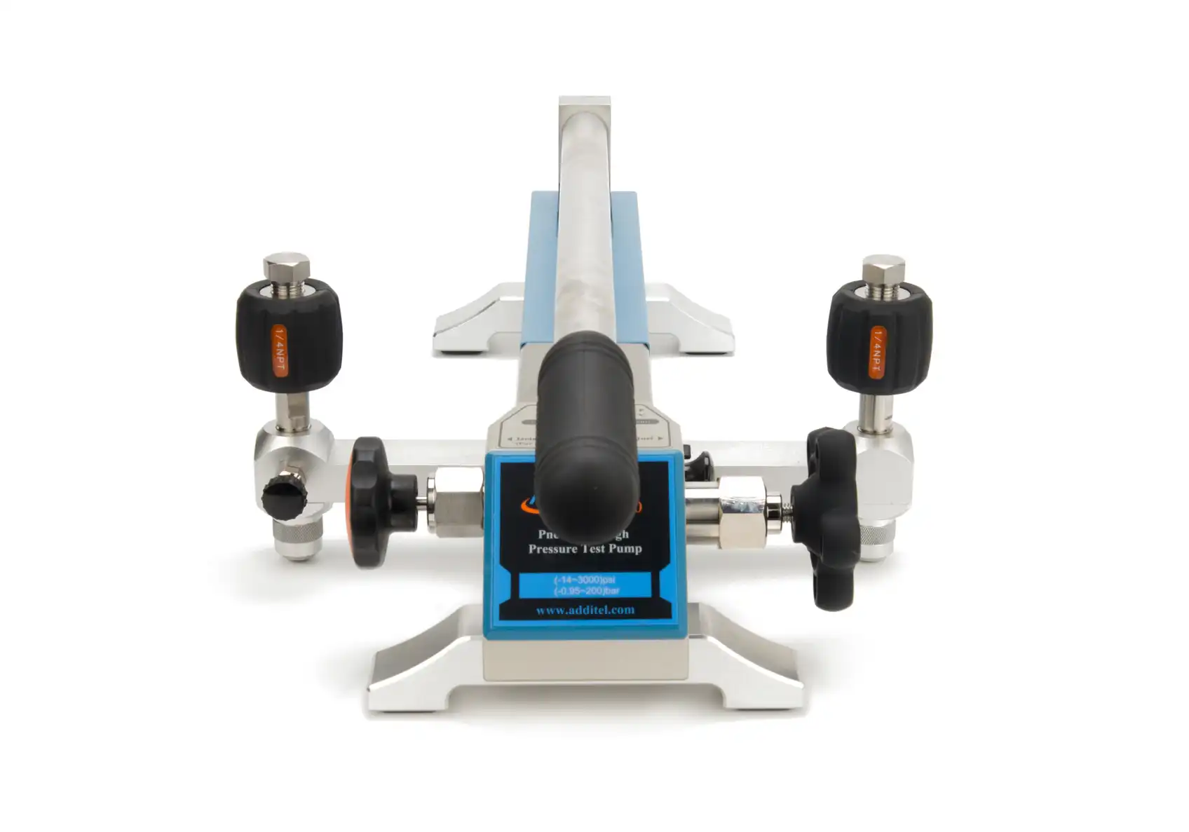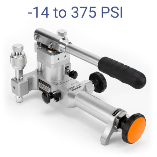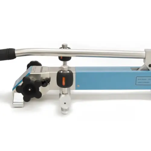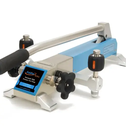 The 919A High Pressure Test Pump is a hand operated pressure pump designed to generate pressure from 95% vacuum to 2,000psi (140bar). With a long lever, it just takes 30 seconds to reach 2,000 psi (140 bar). A high-quality screw press is designed for fine pressure adjustment, with an adjustment resolution up to 0.001 psi (10 Pa , 0.1 mbar). A specially designed shut-off valve makes the pressure as stable as possible during calibration. A built-in gas-liquid isolator protects the pump from moisture and dirt to reduce the need for maintenance. The residual liquid in the pump introduced from the devices under test will be collected and then pushed out during pressure release. Two hand-tight quick connectors installed on the pump allow easy connecting and disconnecting to the test pump without the need for PTFE tape or wrenches. The 919A is an ideal comparison test pump for pressure instruments calibration.