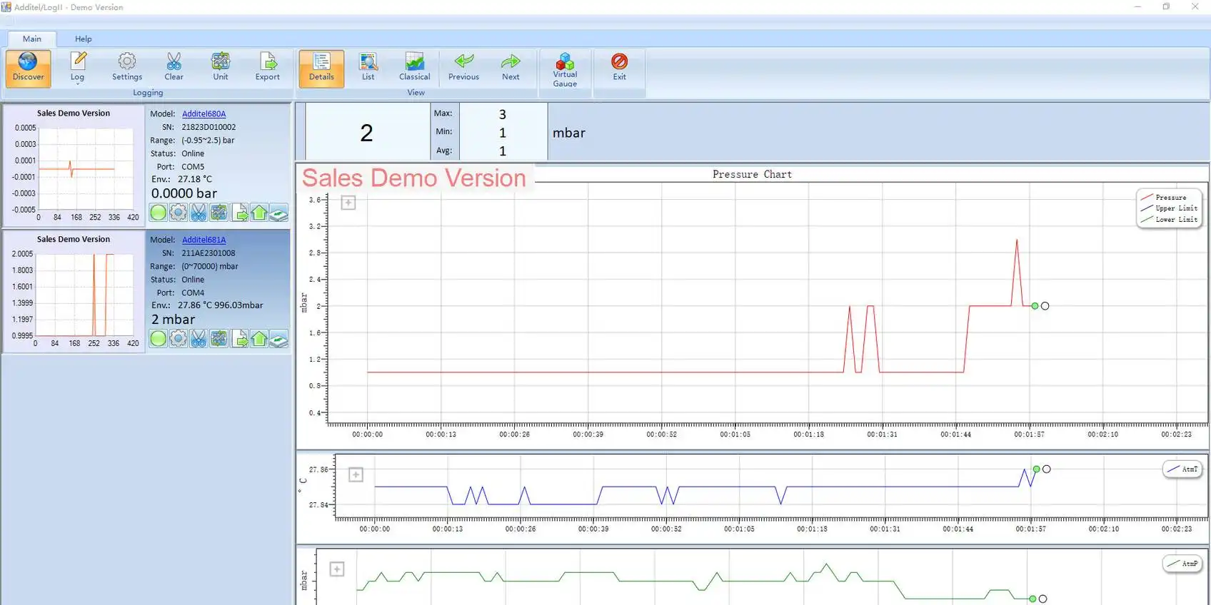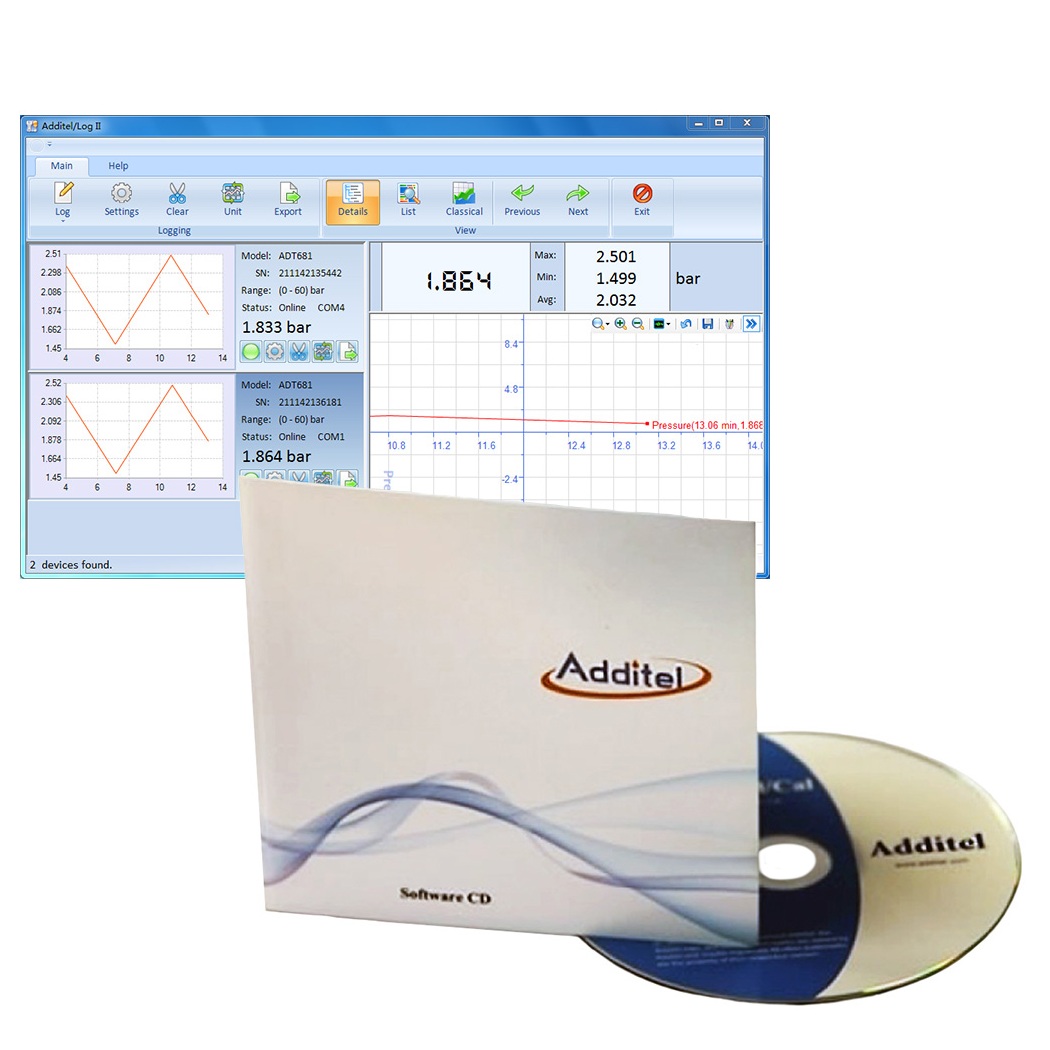 Additel LogII is a real-time data logging and graphical software for the ADT681/ADT680W series digital Pressure gauges, the ADT672 series digital pressure calibrators, and the ADT760 Automatic Handheld Pressure Calibrator. Data can be recorded in real-time and for the ADT681/ADT680W data logging version, recorded results can be uploaded. After results are stored, they can be exported to a customizable report showing pressure and ambient temperature. Each real-time test can be tagged with a unique record name.