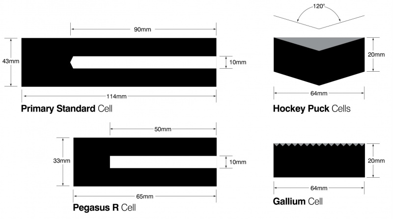 Primary Standard cells fit into the Medusa and Oberon, covering from Indium to Copper Points. These cylindrical cells are 42mm diameter and have a cavity 9mm diameter x 87mm deep. The Medium Temperature “Hockey Puck” cells are 64mm diameter and fit into the Gemini R. There are a range of High Temperature Cells for the Pegasus, 33mm diameter with a 10mm cavity.