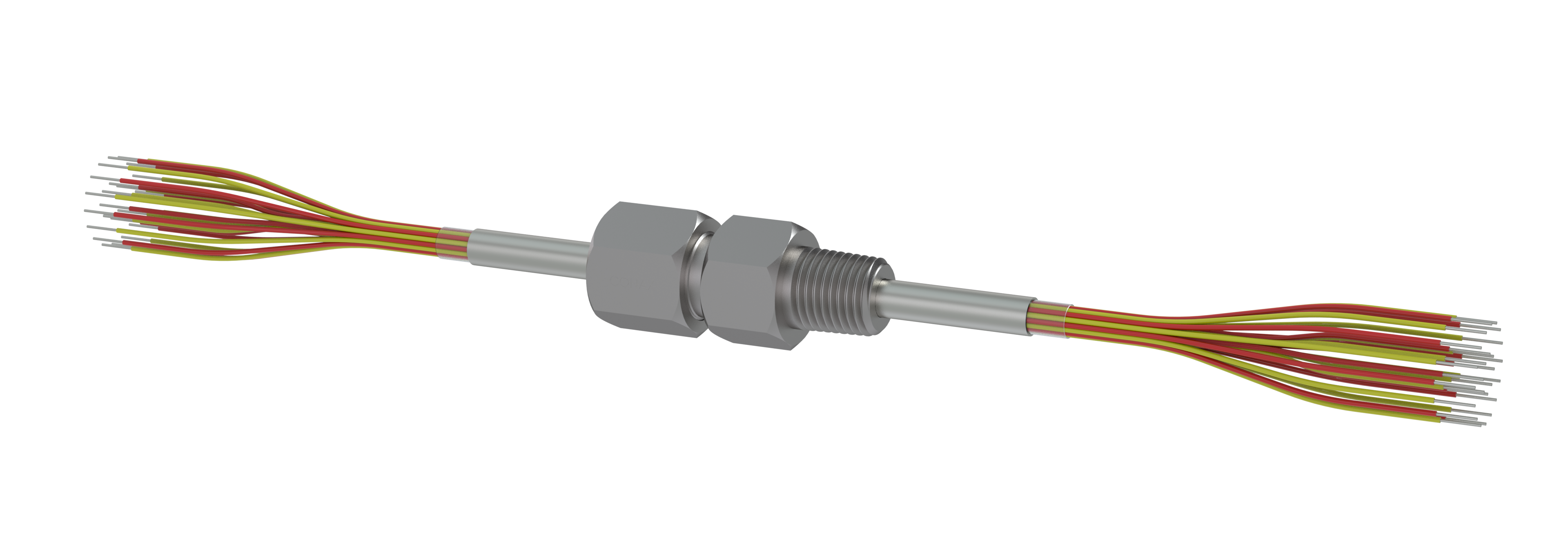 High Density (HD) assemblies consist of a stainless steel tube swaged over 12, 24, 40 or 60 bundled PTFE coated thermocouple grade and/or copper wires, providing a continuous wire feedthrough for thermocouples, RTDs or low voltage instrumentation. No epoxy or potting is used in the construction. The assembly can be furnished with or without junctions and comes standard with 24 inches of leadwire on each end. Longer wire lengths can be supplied as required. A single high density feedthrough can pass through a Conax PG Fitting for environmental sealing. Greater density through a single port can be achieved by using a Conax MHM Fitting that accommodates multiple HD assemblies.
