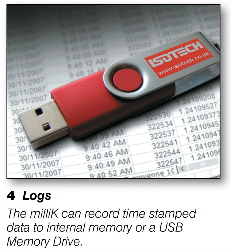 In addition to low uncertainty measurements from Reference Standards and Industrial sensor measurement the milliK can control Isotech temperature sources, sequencing through a programmable list of temperature set points and log data to internal memory or a USB drive.