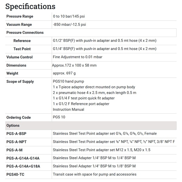 The PGS-10 is a very low-pressure pneumatic hand pump designed to generate both vacuum to -0.850 mbar and pressure up to 10 bar/145 psi. The PGS-10 has two pressure ports with quick fit connectors for the reference pressure indicator and the unit under test. Test hoses are terminated with a push-in 1/4-BSP female for unit under test and 1/2″ BSP Female for reference.