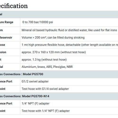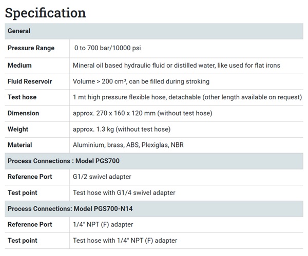 The PGS700 is a hand operated hydraulic pressure pump capable to generate calibration pressures up to 700 bar/10000 PSI.