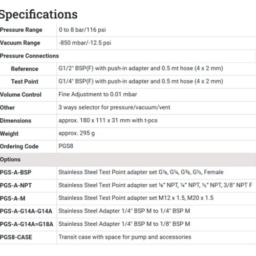 The PGS-8 is a low-pressure pneumatic hand pump designed to generate both vacuum to -0.850 mbar and pressure up to 8 bar/116 psi. The PGS-8 has two pressure ports with quick fit connectors for the reference pressure indicator and the unit under test. Test hoses are terminated with a push-in 1/4-BSP female fittings that can be adapted with our range of BSP, NPT or Metrics adapters.