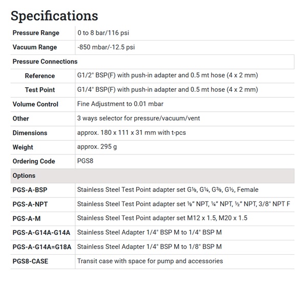 The PGS-8 is light, compact and very easy to use. The special and very sensitive vernier control allow for precise pressure setting with in 0.01 mbar.