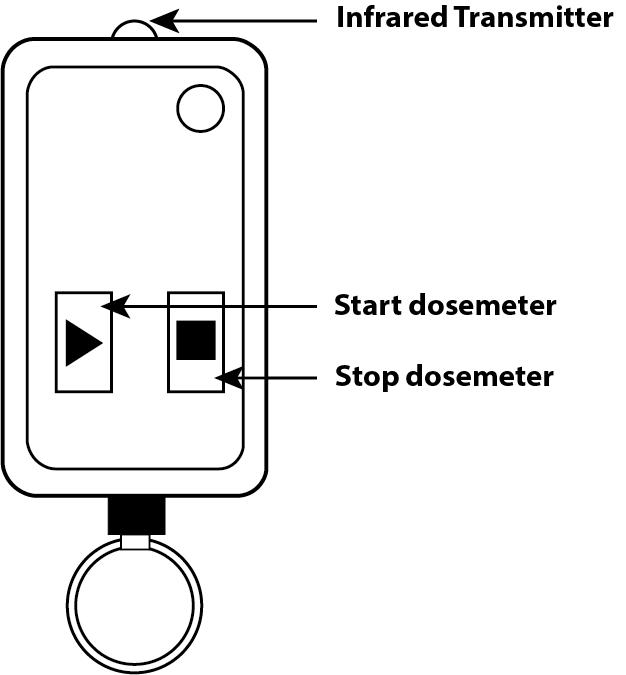 The Remote Start Keyfob for NoiseBadge dosemeter can be used instead of the Reader Unit to Start and Stop Pulsar NoiseBadge Dosemeters. The Start and Stop buttons on the Keyfob are used to send commands to the noise dosemeter.