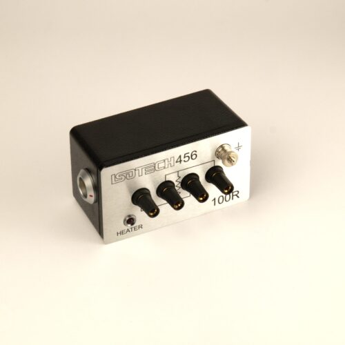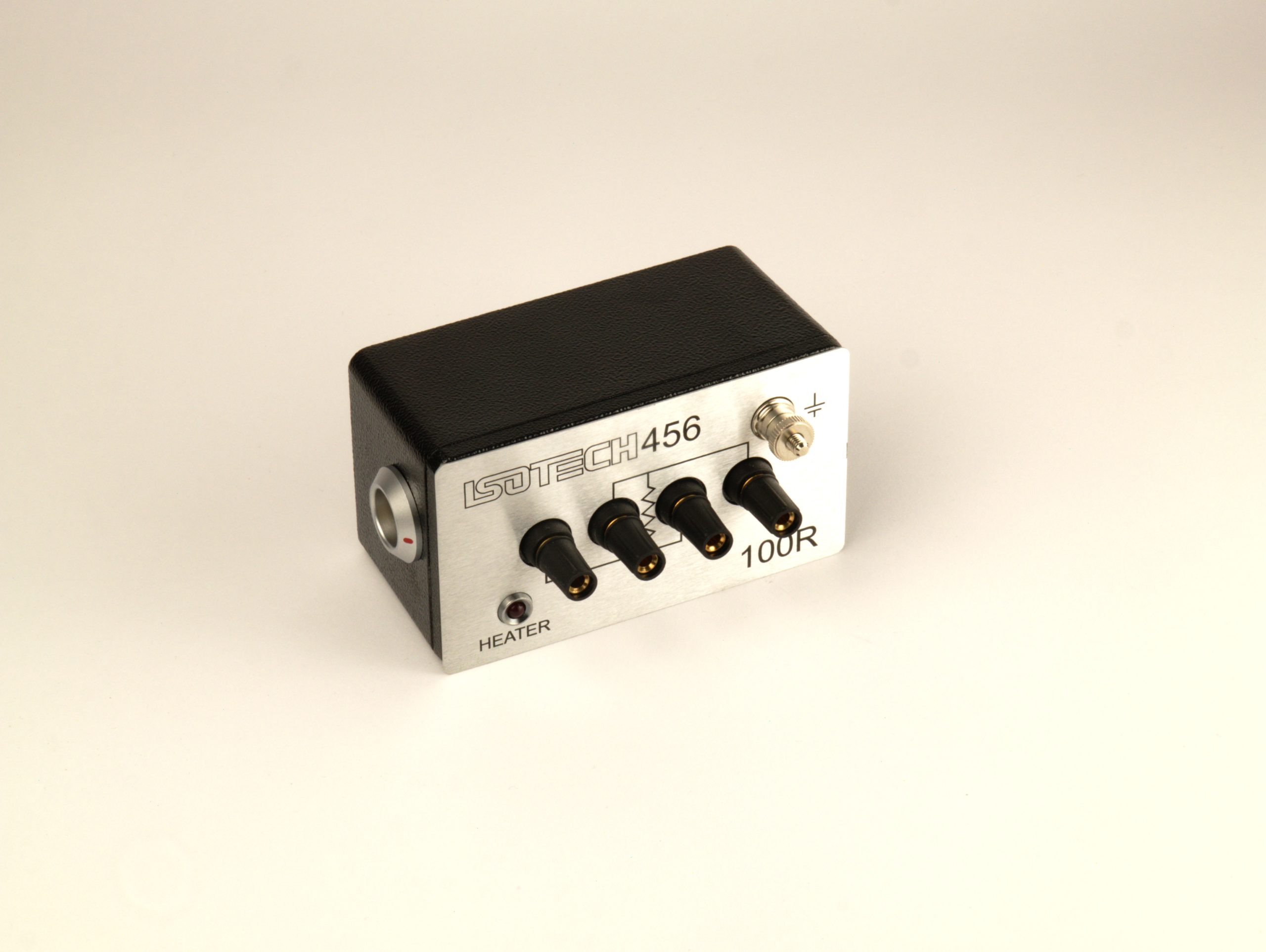 The Resistor is held in a temperature controlled environment heated to 30°C ±0.1°C other temperatures are available to special order. The heater requires 2 watts at 5V which can be supplied by a battery or an unregulated DC supply. In an ambient of 20°C the Resistor’s heater will warm up in typically 30 minutes, and an LED shows when the temperature has been reached. A test pocket is provided so that the resistors’ temperature can be monitored if required.